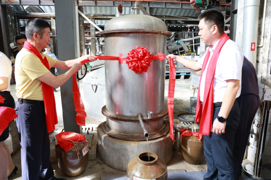 在主持人的引導(dǎo)下,領(lǐng)導(dǎo)與嘉賓們興致盎然地行至酒甑前。蒸汽裊裊,酒香四溢,已然令人微醺。李大攀、謝永文為酒甑揭開紅綢,開啟新釀。只見清亮剔透、散發(fā)著溫?zé)釟庀⒌木埔壕従徚鞒?,精?zhǔn)地落入壇中,發(fā)出清脆悅耳的聲響。在升騰的酒香中,大家一同舉杯,品飲秋釀,深刻感受美酒背后承載的文化與匠心。